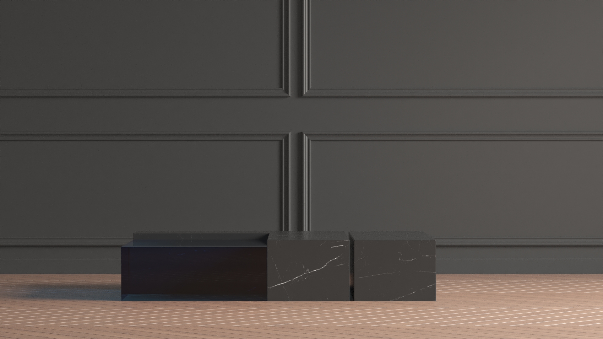 Geometric coffee tables in high-gloss lacquer.
